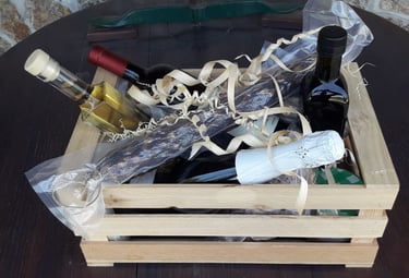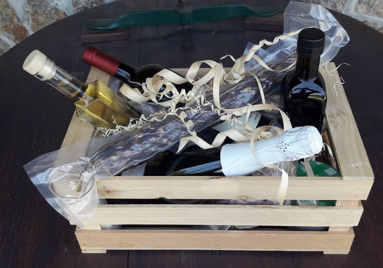 Naši darilni paketi vsebujejo skrbno izbrane domače dobrote in vrhunska vina za vaše goste.